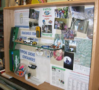 It was time to decide what would be put inside the display. They used pictures of local geocachers on geocache hunts, topographical maps, cache containers, samples of signature items and trinkets. Travel bugs and geocoins were placed inside the exhibit on a glass shelf, facing outward for people to see (and to "discover" via geocaching.com). One item that Rich thought would be a good addition was a GPS. He called up the sales department at Garmin and explained the project. A few days later he received an empty Garmin "yellow" case in the mail.